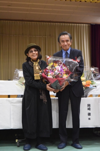 ひし美ゆり子さんと岡崎さんに湯前町から結婚祝いのお花を頂きました。